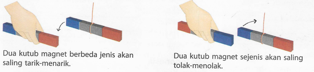 Apakah kalian pernah mendekatkan dua magnet? Apa yang terjadi? Kedua magnet dapat saling tarik-menarik tetapi juga dapat saling tolak-menolak. Jika dua kutub magnet berbeda jenis (utara-selatan) didekatkan, magnet akan saling tarik-menarik. Sebaliknya, jika dua kutub magnet sejenis (utara-utara atau selatan-selatan) saling didekatkan, kedua magnet akan saling tolak-menolak.
