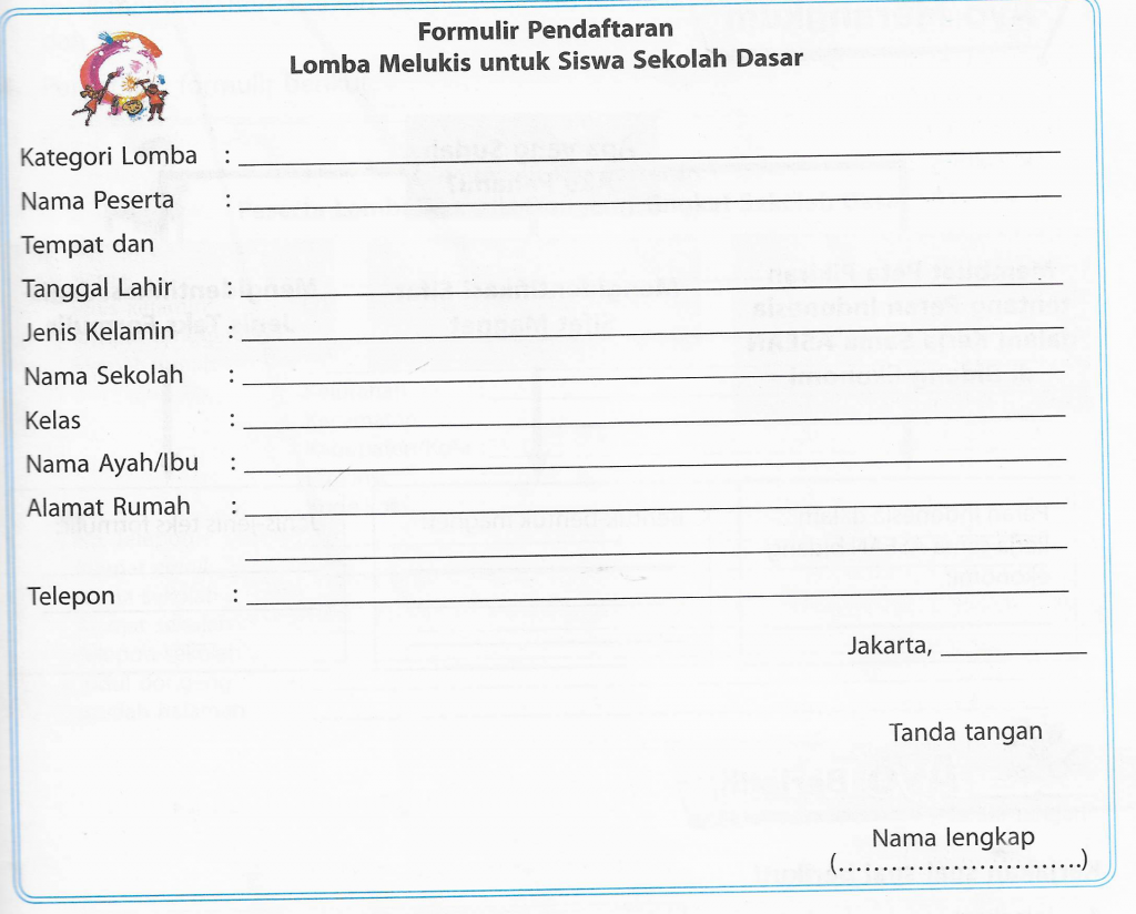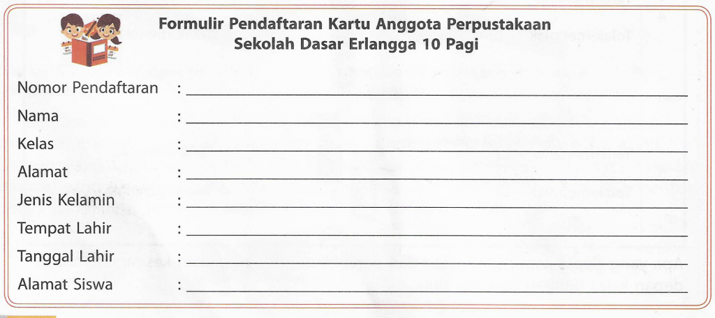 Selain untuk keperluan belanja daring, formulir juga dapat kita temukan saat ingin bergabung atau mendaftar dalam suatu klub, organisasi, lembaga, atau perusahaan. Apakah kamu pernah melihat atau mengisi formulir? Formulir adalah lembar yang berisi informasi tentang data diri dan hal lain sesuai dengan fungsi formulir tersebut. Dalam sebuah formulir biasanya berisi poin-poin yang harus diisi, antara lain nama, alamat rumah, usia, tempat tanggal lahir, nama orang tua, serta kontak yang dapat dihubungi seperti nomor telepon atau alamat surel.