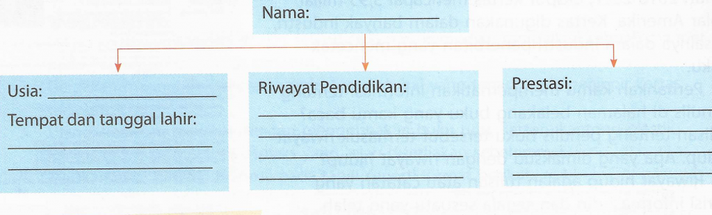 Daftar riwayat hidup biasanya dibuat untuk mendaftar sekolah, kegiatan, perlombaan, atau pekerjaan. Sebelum membuat daftar riwayat hidup, coba tuliskan informasi mengenai dirimu secara rinci! Tuliskan informasi sebanyak mungkin mengenai dirimu untuk disampaikan kepada orang lain! Tuliskan informasi tersebut dalam bentuk peta pikiran seperti contoh berikut!